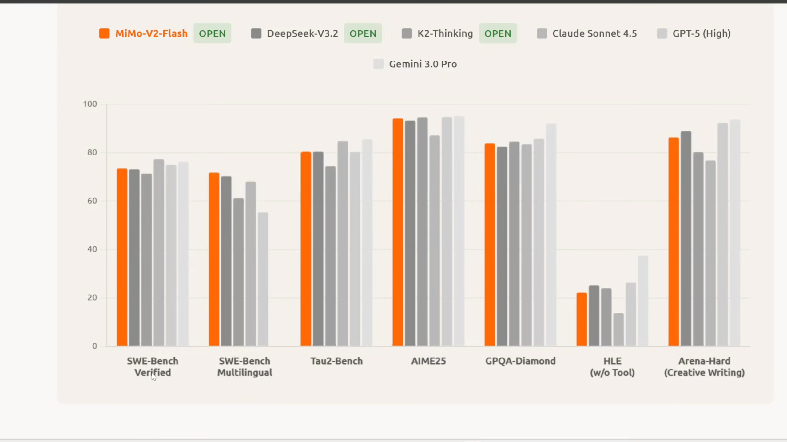MiMo V2 Flash positioniert sich nicht als "noch ein weiteres LLM", sondern als spezialisiertes Werkzeug für Reasoning (logisches Denken) und Coding-Aufgaben. In standardisierten Tests wie dem SWE-bench Verified (einem Benchmark für reale Software-Engineering-Aufgaben) schlägt es nicht nur etablierte Open-Source-Konkurrenten wie DeepSeek V3 oder Kimi k2, sondern konkurriert sogar auf Augenhöhe mit proprietären Giganten.