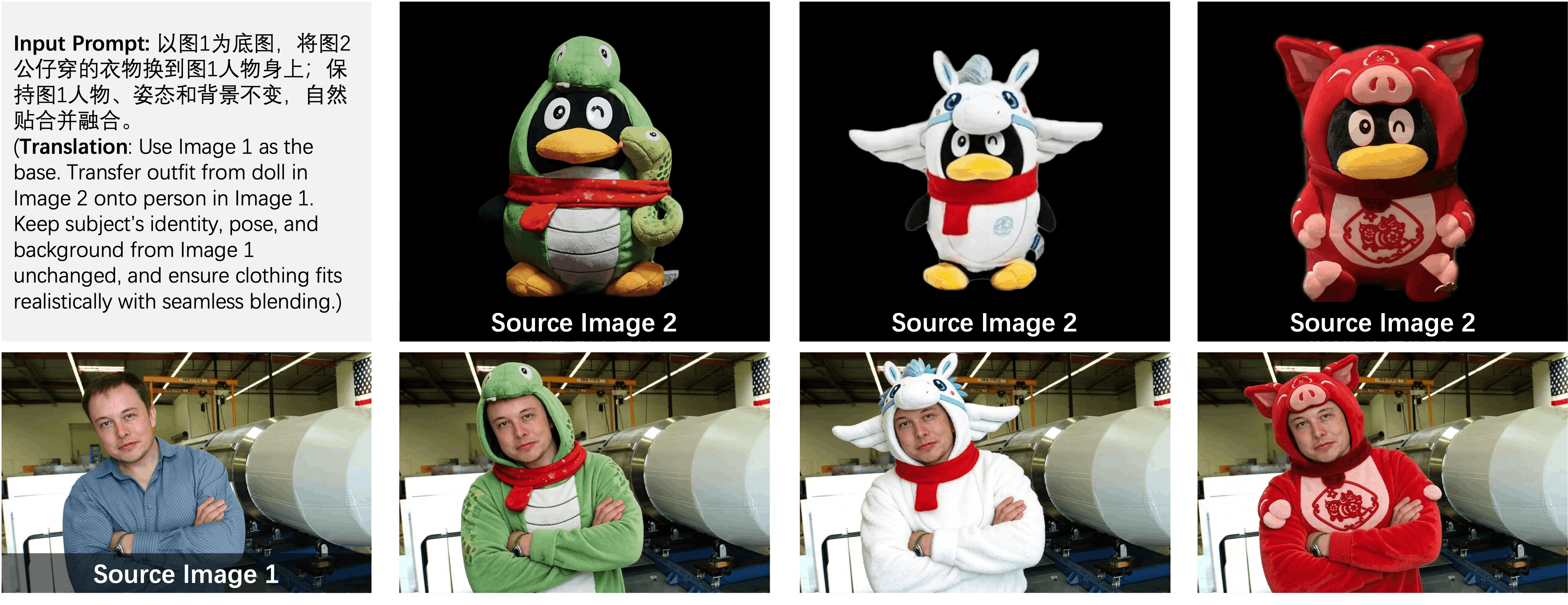 Die Leistungsfähigkeit von HY-WU zeigt sich besonders beim "Cross-Domain"-Transfer. Wie das Beispiel zeigt, kann das Modell problemlos ein Kostüm, das von einer Plüschfigur getragen wird, realitätsgetreu auf einen menschlichen Körper mappen, inklusive logischer Anpassungen der Proportionen. Dies revolutioniert die Produktfotografie, da Model-Shootings für neue Kollektionen nun vollständig virtuell und mit beliebigen Referenzbildern durchgeführt werden können.
